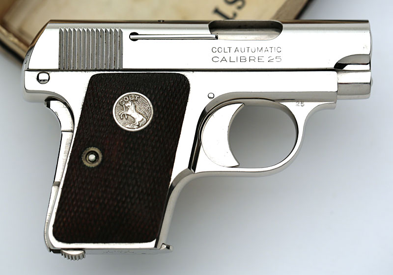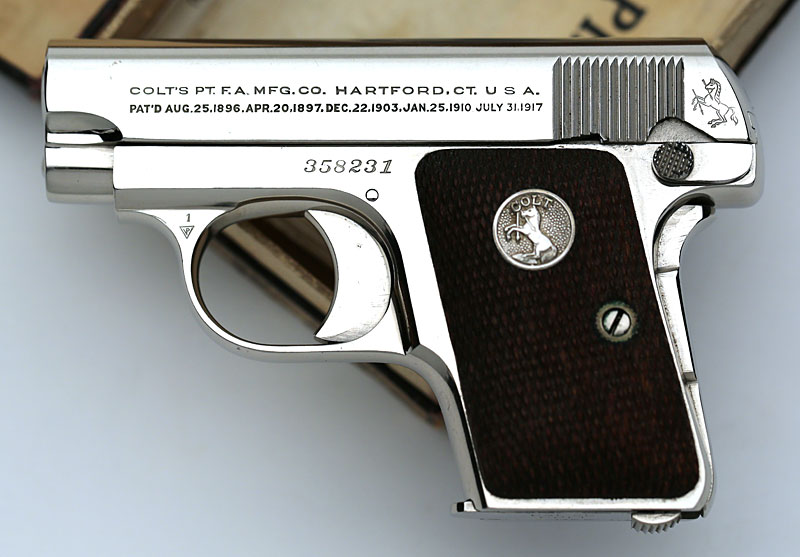 Colt 1908 Vest Pocket .25 ACP serial number 358231 - Pistol has factory nickel plated finish with checkered walnut stocks with flush Colt medallions and is accompanied by the original box numbered to the gun.