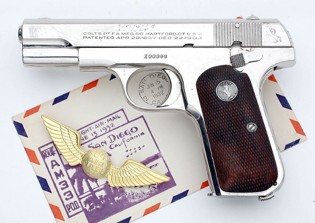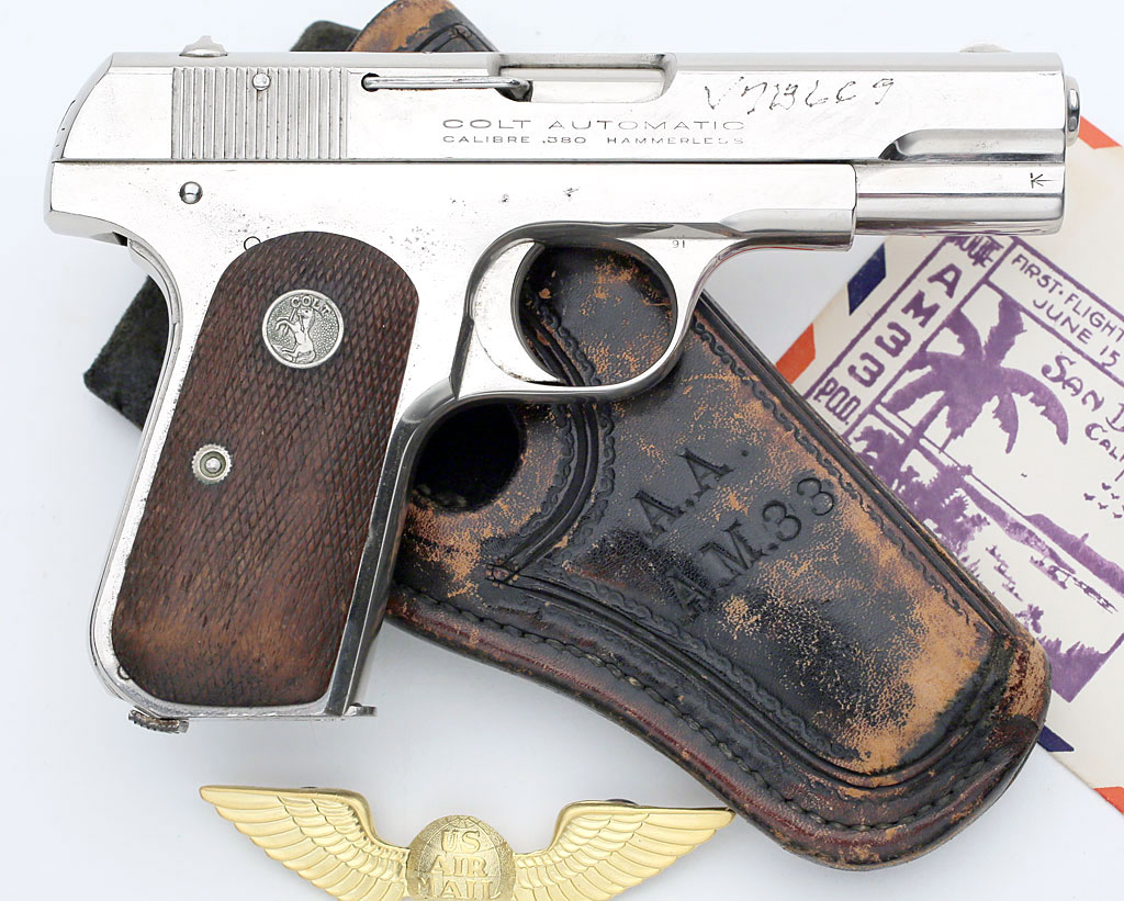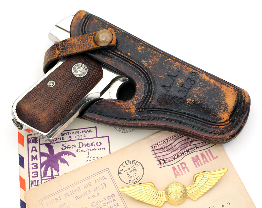 Colt Pocket Hammerless 1908 .380 ACP serial number 100046 (ca. 1928) - pictured with original holster, air mail wings and two original letter covers commemorating the First Flight of Air Mail Route 33.
