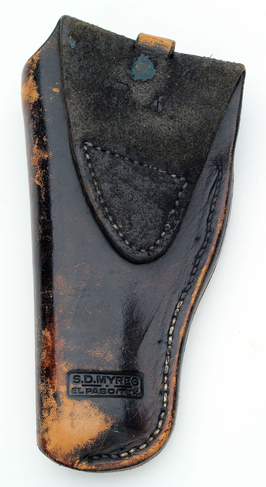 Colt Pocket Hammerless 1908 .380 ACP serial number 100046 (ca. 1928) - original S.D. Myres holster (rear view) that US Air Mail pilot Russel Arden carried when transporting the mail.