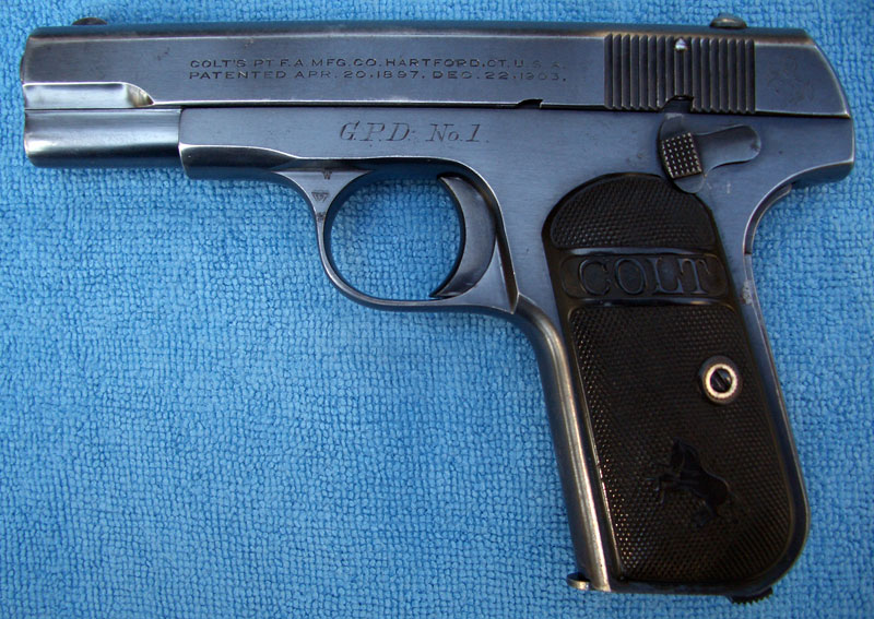 Model M .32 serial number 381489 with factory inscription "G.P.D. No. 1" engraved (not roll marked) on the left side of the frame where the serial number is typically located.  This was one of 13 guns shipped to the Gloversville, NY Police Department in the 1920s.  It is interesting to note that in order to accommodate the location of the inscription, the serial number was factory engraved on the right side of the frame.