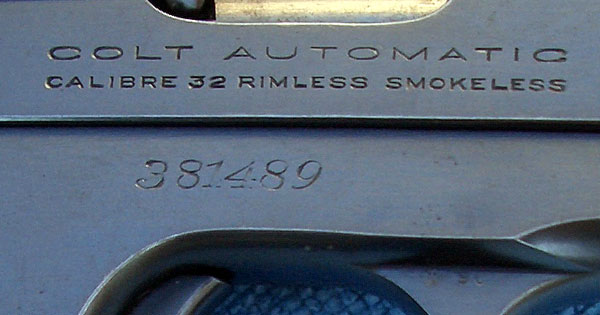 Model M .32 serial number 381490 with factory inscription "G.P.D. No. 2" engraved (not roll marked) on the left side of the frame where the serial number is typically located.  This was one of 13 guns shipped to the Gloversville, NY Police Department in the 1920s.  It is interesting to note that in order to accommodate the location of the inscription, the serial number was factory engraved on the right side of the frame.