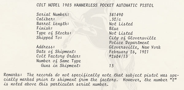 Factory letter for GPD marked Colt 1903 Pocket Hammerless .32 ACP indicates that the gun was one of 13 shipped to the City of Gloversville Police Department, Gloversville, New York on February 26, 1921.  Processed on Colt Factory Order number 2604/13.