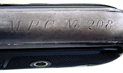 Model M .380 serial number 1869 factory inscribed "M.P.C. No. 112" on grip safety.  One of the earliest known police marked examples shipped on late 1908/early 1909 with barrel bushing.  This police contract is the earliest contract on record at Colt for the .380 caliber Model M pistols. MPC is believed to be the Metropolitan Parks Commission (Boston PD).  There were a total of 214 pistols sn 1328 - 14644 shipped 12/5/08 - 6/4/13.