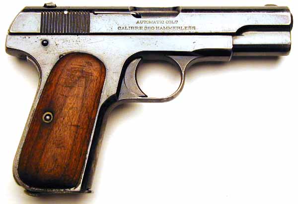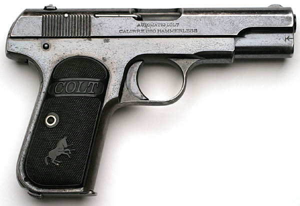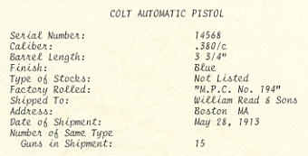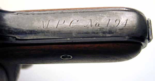 Model M .380 serial number 14568 factory inscribed "M.P.C. No. 194" on grip safety.  One of 15 pistols shipped to William Reed & Sons, Boston, MA on May 28, 1913.  An example from near the end of the contract run with integrated barrel bushing  Grips have been replaced with smooth walnut type.  This police contract is the earliest contract on record at Colt for the .380 caliber Model M pistols. MPC is believed to be the Metropolitan Parks Commission (Boston PD).  There were a total of 214 pistols sn 1328 - 14644 shipped 12/5/08 - 6/4/13.
