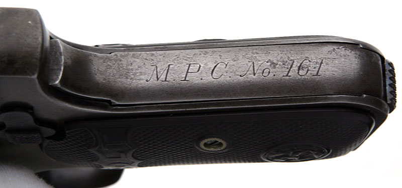 Model M .380 serial number 4406 factory inscribed "M.P.C. No. 161" on grip safety.  An early police marked example with separate barrel bushing and one of 17 shipped on December 7, 1909 to Iver Johnson Sporting Goods Company, Boston, Massachusetts.  This police contract is the earliest contract on record at Colt for the .380 caliber Model M pistols. MPC is believed to be the Metropolitan Parks Commission (Boston PD).  There were a total of 214 pistols sn 1328 - 14644 shipped 12/5/08 - 6/4/13.