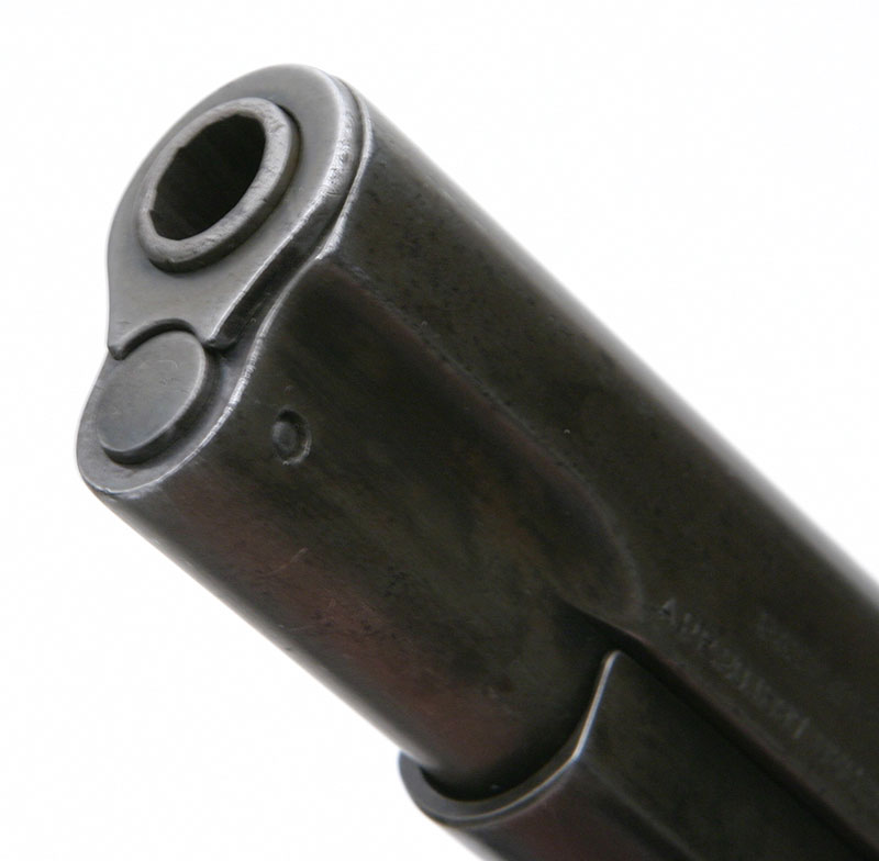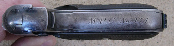 Model M .380 serial number 14578 factory inscribed "M.P.C. No. 214" on grip safety.  The highest number in contract run with integrated barrel bushing  This police contract is the earliest contract on record at Colt for the .380 caliber Model M pistols. MPC is believed to be the Metropolitan Parks Commission (Boston PD).  There were a total of 214 pistols sn 1328 - 14644 shipped 12/5/1908 - 6/4/1913.