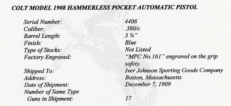 Known Colt 1908 .380 ACP MPC Inscribed Pistols by Issue Number