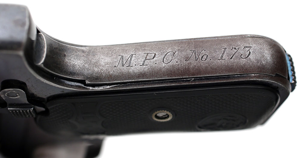 Model M .380 serial number 5635 factory inscribed "M.P.C. No. 173" on grip safety.  One of the earliest known police marked examples shipped in late 1908/early 1909 with barrel bushing.  This police contract is the earliest contract on record at Colt for the .380 caliber Model M pistols. MPC is believed to be the Metropolitan Parks Commission (Boston PD).  There were a total of 214 pistols sn 1328 - 14644 shipped 12/5/08 - 6/4/13.