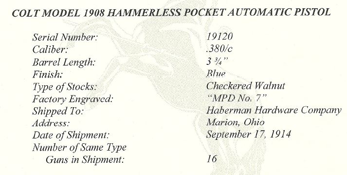 is one of 16 pistols ordered and shipped to Haberman Hardware Company for