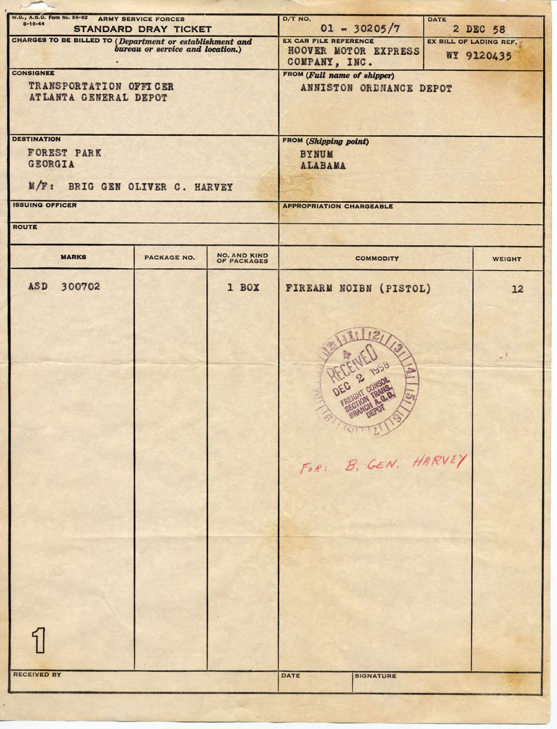 Standard Dray Ticket for transport and delivery of BG Harvey's Colt 1903 .32 ACP General Officer pistol.