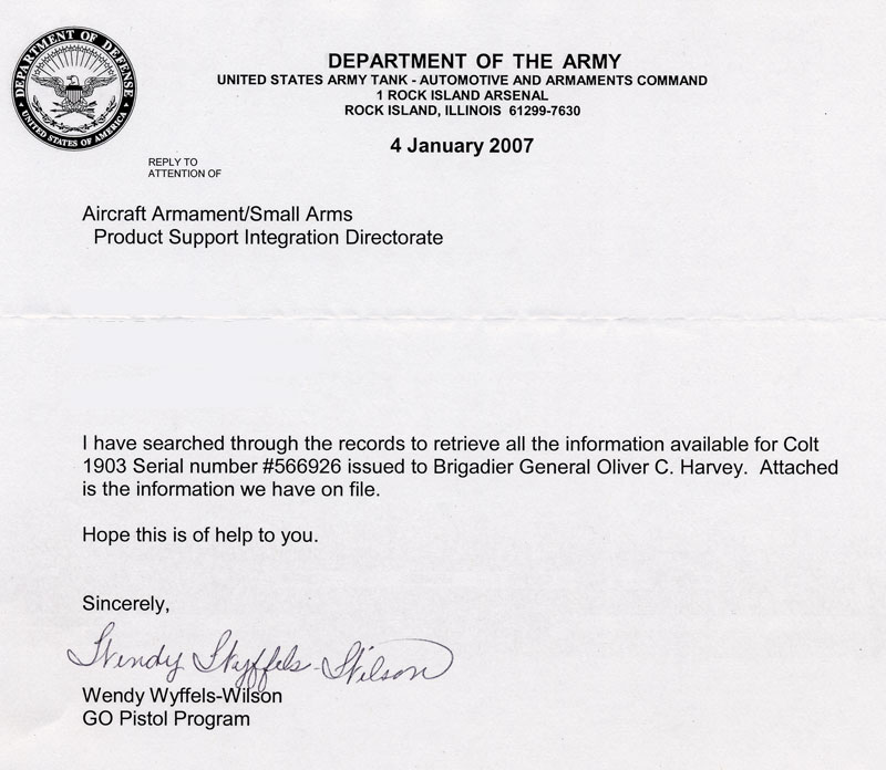 Letter from Rock Island Arsenal which documents the issue of Colt Model 1903 .32 ACP serial number 566926 to then Brigadier General Oliver C. Harvey.