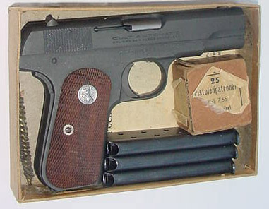 Pistol is in excellent condition and has the original box (numbered to the gun), instruction sheet, and two spare full blued magazines.  Also accompanying but not original to the pistol when shipped were a Belgian box of ammo, commercial wire cleaning brush and brass cleaning brush tip.