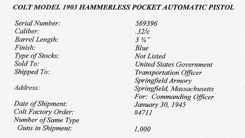 Pistol was one of 1,000 sold to the United States Government and shipped January 30, 1945 to the Transportation Officer, Springfield Armory, Springfield, Massachusetts.  It was processed on Colt Factory Order number 4711.