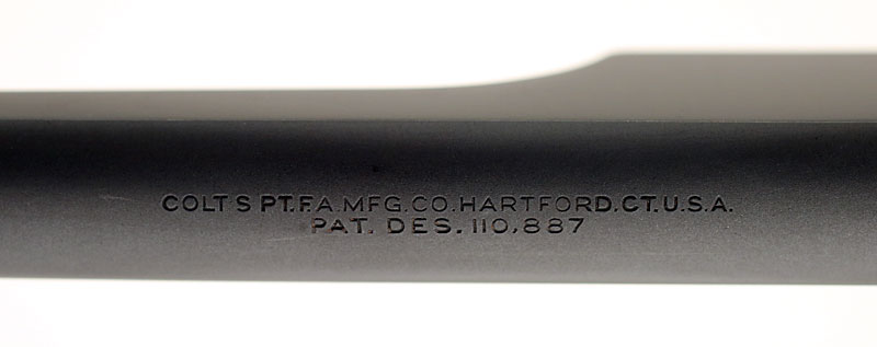 Top of the barrel is rollmarked "COLT'S PT. F.A. MFG. CO. HARTFORD. CT. U.S.A." over "PAT. DES. 110,887"