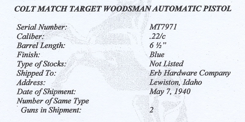 Colt Woodsman Bullseye Match Target .22 LR serial number MT7971 (ca. 1940) - This First Series Colt Woodsman Match Target is accompanied by a deluxe set of period target stocks with thumb rest and palm swell. This pistol has the Stevens adjustable rear sight. This Woodsman Match Target was part of a two gun shipment shipped to Erb Hardware Company, Lewiston, ID, on May 7, 1940.